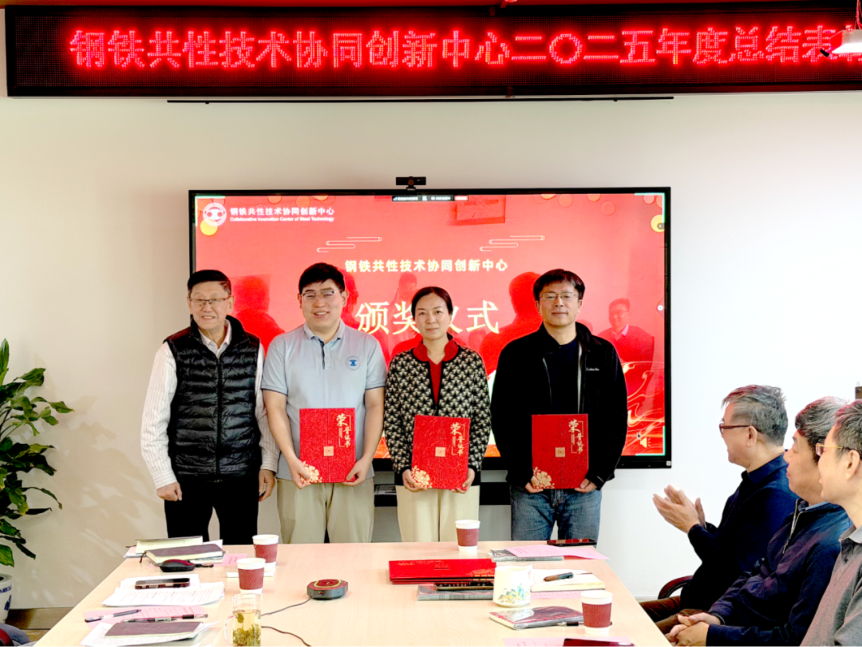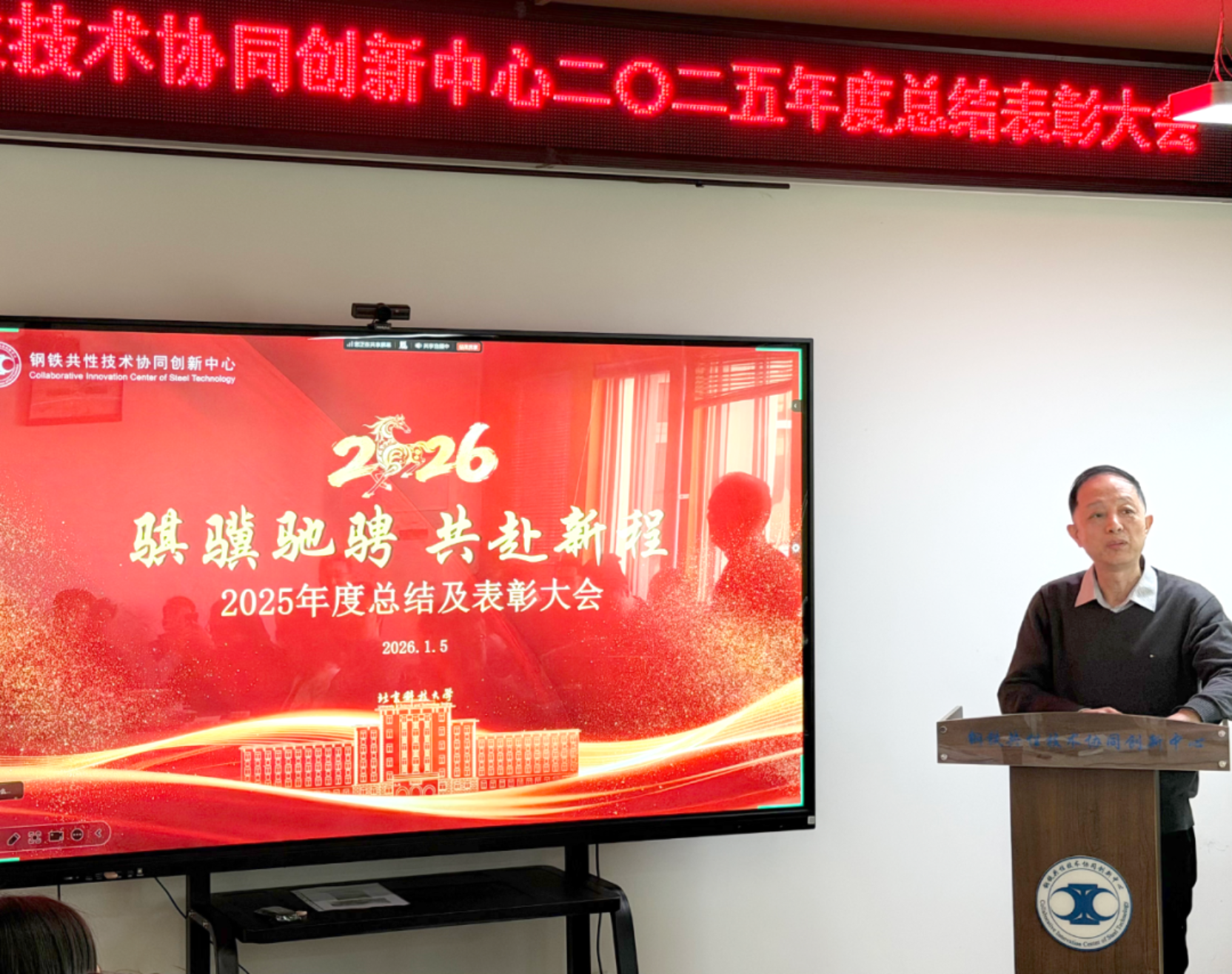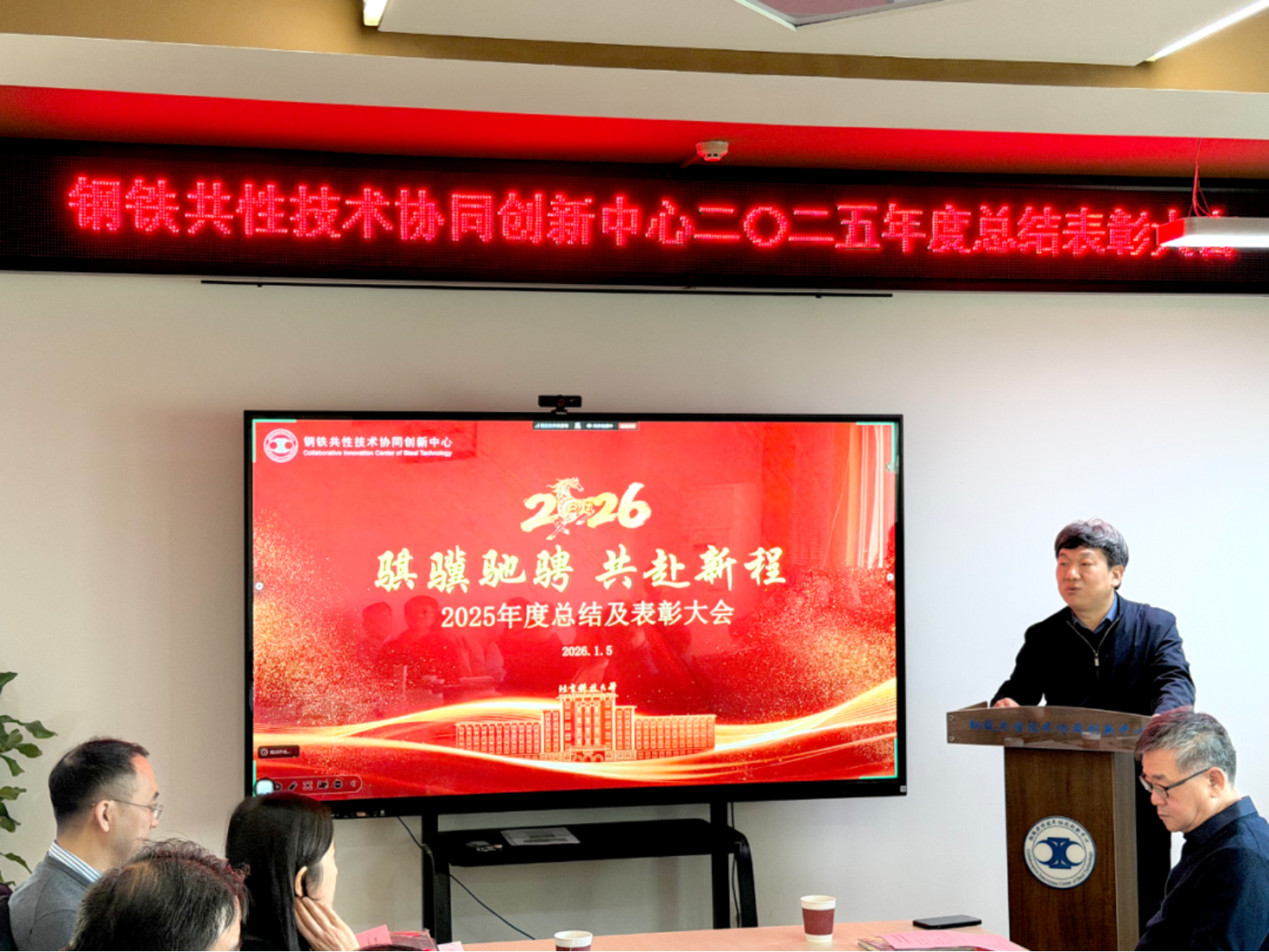 2026年1月5日,钢铁共性技术协同创新中心2025年度总结及表彰大会在科技楼801举行。中心领导班子成员、全体教职工和退休教师代表参加大会,会议采取线上线下相结合的方式进行,由中心副主任洪歌主持。